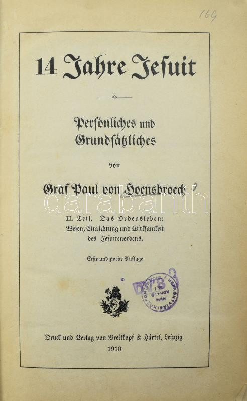 Paul von Hoensbroech: 14 Jahre Jesuit. II. Teil. Leipzig, 1910., Druck... https://www.darabanth.com/de/510-Fernauktion/510.0/Bucher/Bucher-Religion~780/Paul-von-Hoensbroech-14-Jahre-Jesuit-II-Teil-Leipzig-1910-Druck-und-Verlag-Nemet-nyelven-E~II3430079
