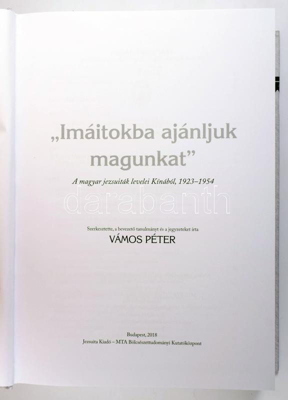 Vámos Péter: ,,Imáitokba ajánljuk magunkat". A magyar jezsuiták levelei Kínából, 1923-1954. Szerk., a bevezető tanulmányt és a jegyzeteket írta: - - . Bp., 2018, Jezsuita Kiadó - MTA Bölcsészettudományi Kutatóközpont, 823 p. Kiadói kartonált papírkötés.
