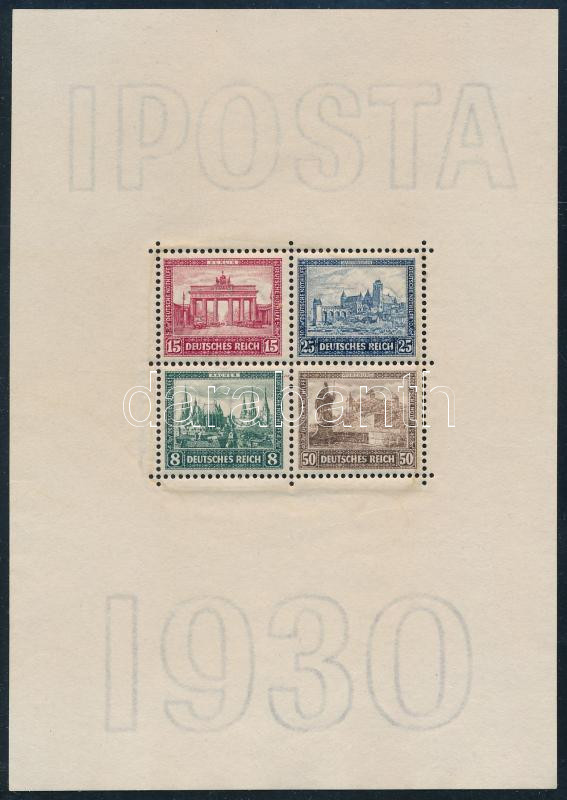 Deutsches Reich 1930 IPOSTA blokk Mi 1 luxus minőség. (Mi EUR 1.600.-) https://www.darabanth.com/de/510-Fernauktion/510.0/Erlesene-Lose-und-Sammlungen-Ausland/Einzelne-Gebotslose-Weltweit~9/Deutsches-Reich-1930-IPOSTA-blokk-Mi-1-luxus-minoseg-Mi-EUR-1600-~II3454700