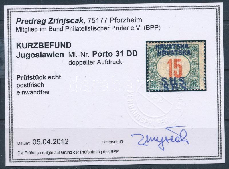 Certif... https://www.darabanth.com/de/510-Fernauktion/510.0/Erlesene-Lose-und-Sammlungen-Ungarn/Einzelne-Gebotslose-Ungarn~1/SHS-1919-Porto-15f-kettos-felulnyomattal-Bodor-vizsgalojellel3Cbr-3E-Certificate-Zrinjscak~II3453717