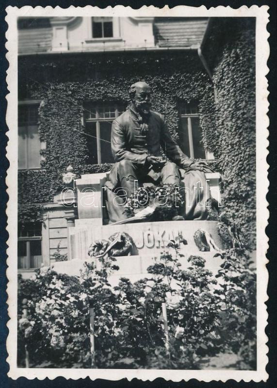 1939 Komárom (Komárno), Jókai Mór szobra (Berecz Gyula alkotása, melyet 1937 novemberében adták át; 1945-ben a többi felvidéki magyar emlékművel együtt eltávolították, de ezek közül elsőként került vissza a helyére 1952-ben), a hátoldalon feliratozott fotó, 9x6 cm