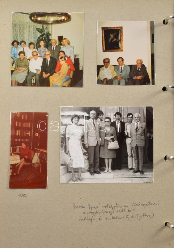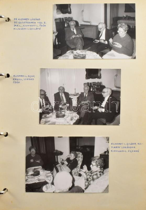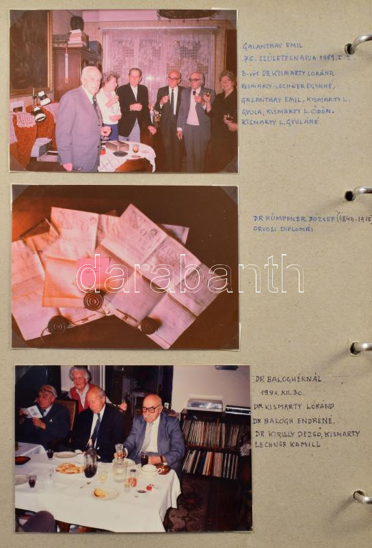 ifj dr Kismarty-Lechner Loránd Kismarty-Lechner JenÅ‘ unokaöccse, Lechner Ödön leszármazottjának és családjának fotóhagyatéka, Családi fotóalbum feliratozva, róla, gyermekeirÅ‘l, rokonságáról készült 1970-70-es években készült fényképek. Mind feliratozva, házi készÃtésű albumban, A képeken többek között szerepel: Kismarty Szandtner Frigyes, Kismarty Lechner Kamill, Rubik ErnÅ‘, Galánthay Emil, Pais Endre, Maczon Frigyes, ifj Kismarty Lóránd, A képek kijárnak. összesen kb 180 db fénykép.