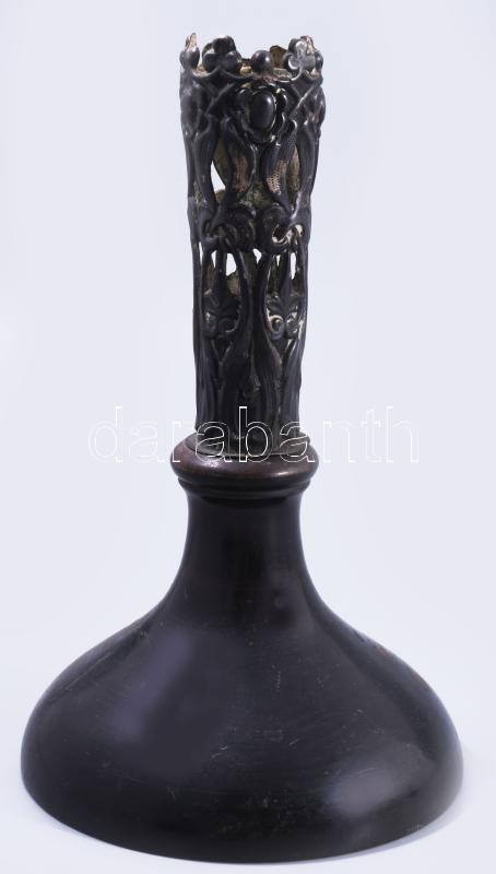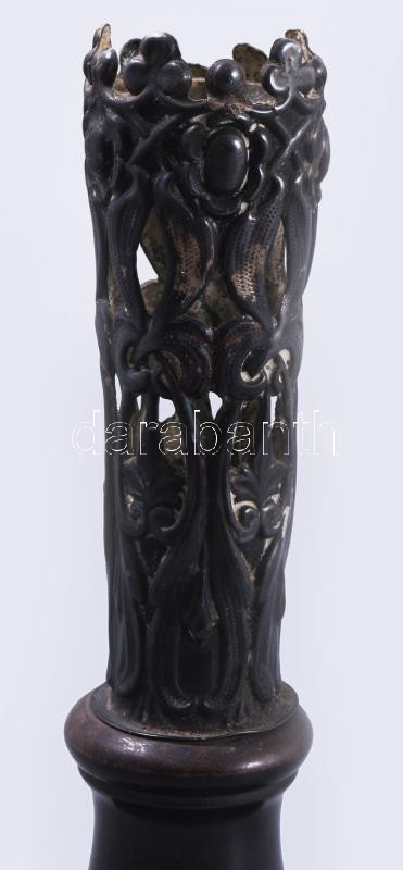Beschreibung: Antik ezüst (Ag) gyertyatartó, fa talapzatban, fém merevítőgyűrűvel, sérült, m: 18 cm