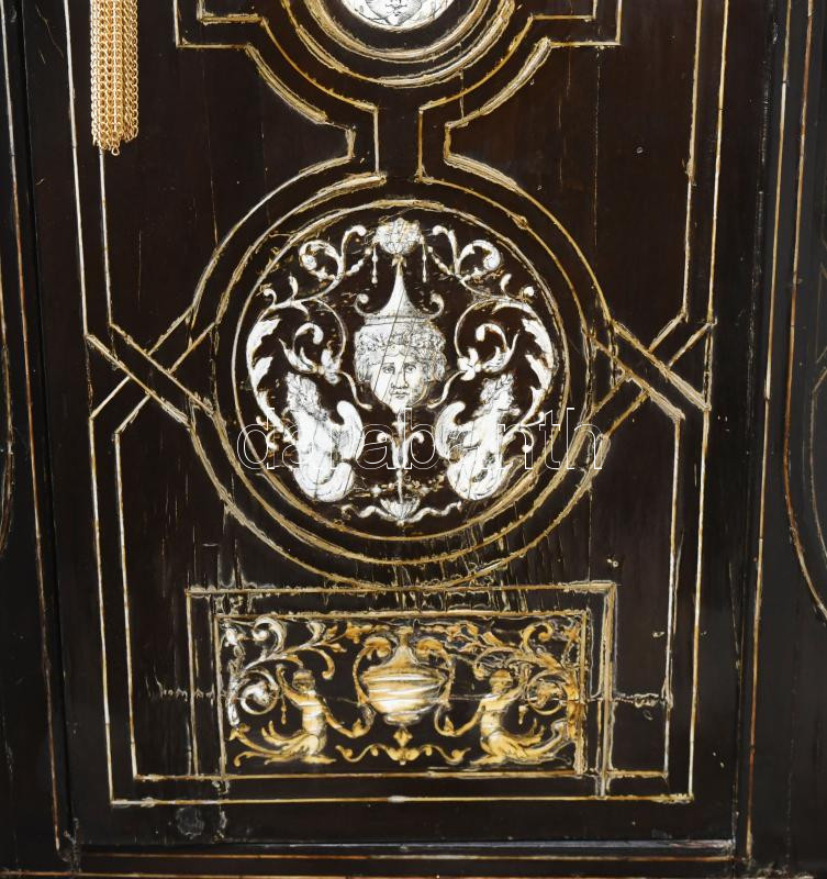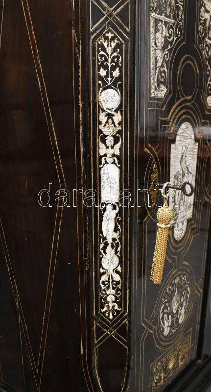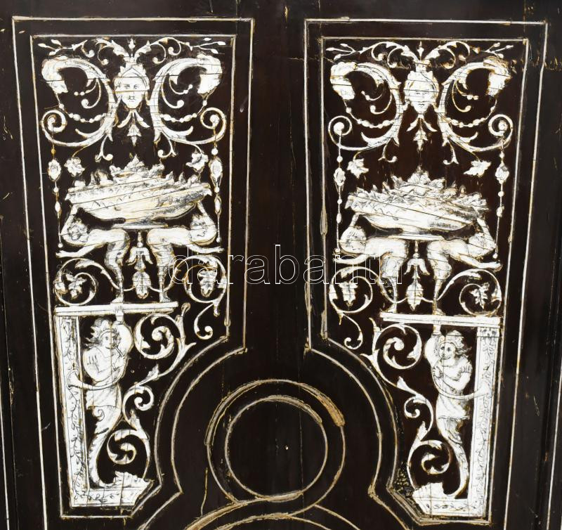 Berainesque stílusú kabinetszekrény. Olasz vagy francia, cca 1850, csontintarziás ébenfa furnérral fedett fa, talpáról levehető, pótolt polcokkal és lábakkal, 134x56x39 cm /// KIZÁRÓLAG SZEMÉLYES ÁTVÉTEL, NEM POSTÁZZUK! / ONLY PERSONAL COLLECTION AT OUR OFFICE!