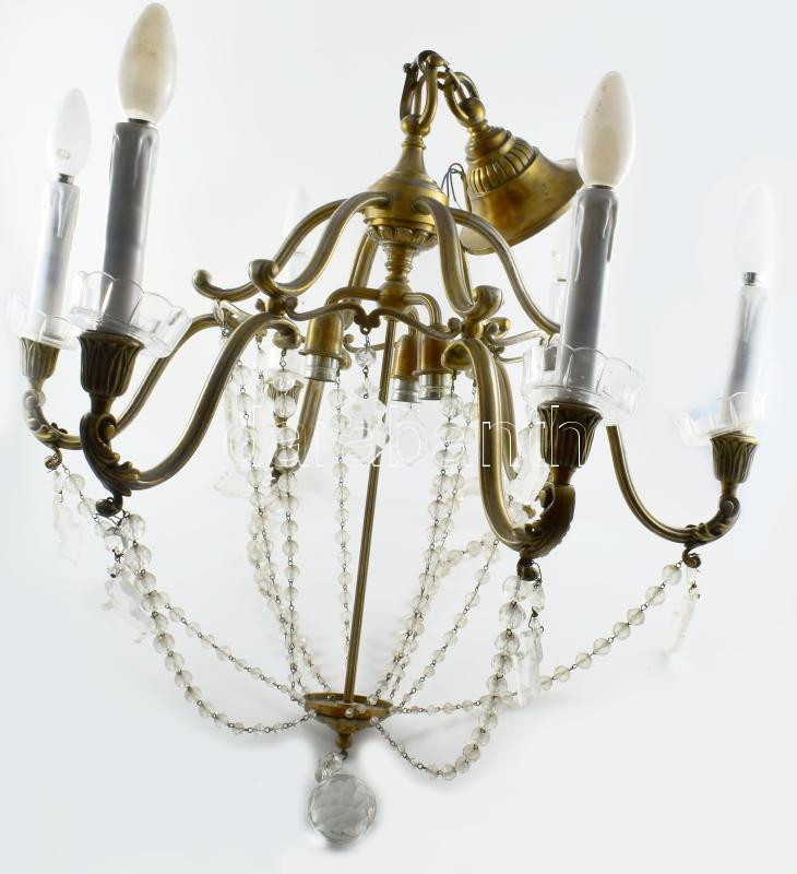 cca 1920/40 Hatágú csillár, üveg prizmasorokkal, tejüveg gyertyákkal, sérüléssel, d: 60 cm, m: 55 cm /// KIZÁRÓLAG SZEMÉLYES ÁTVÉTEL, NEM POSTÁZZUK! / ONLY PERSONAL COLLECTION AT OUR OFFICE