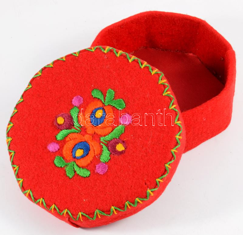 Beschreibung: Hímzett bevonatú díszdoboz, d: 12 cm