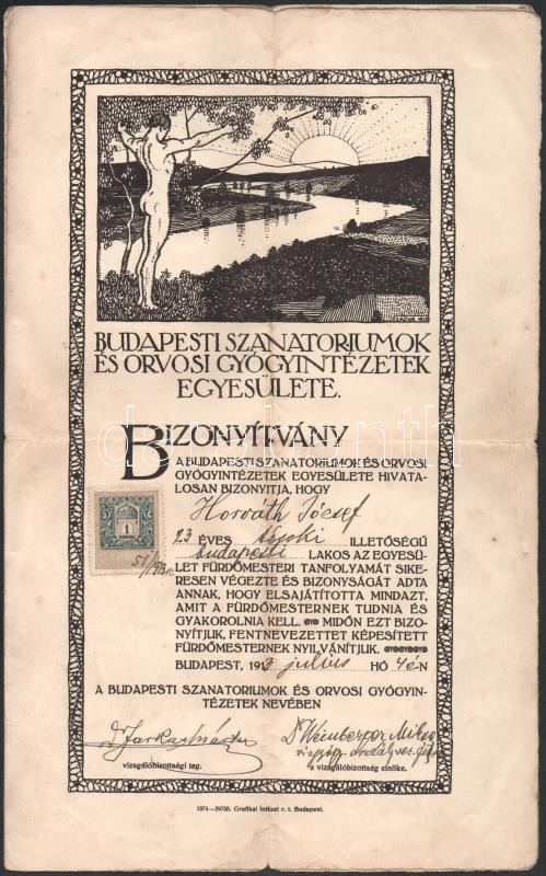 1913 Bizonyítvány szanatóriumok orsz. egyesülete részéről fürdőmester,... https://www.darabanth.com/de/510-Fernauktion/510.0/Kunst-Dokumente-andere-Sammelgebiete/Dokument~803/1913-Bizonyitvany-szanatoriumok-orsz-egyesulete-reszerol-furdomester-masszor-reszere~II3454440