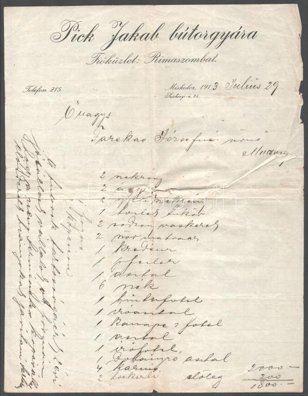 1913 Miskolc, Pick Jakab bútorgyára (fióküzlet Rimaszombat) fejléces s... https://www.darabanth.com/de/510-Fernauktion/510.0/Kunst-Dokumente-andere-Sammelgebiete/Dokument~803/1913-Miskolc-Pick-Jakab-butorgyara-fiokuzlet-Rimaszombat-fejleces-szamla~II3433171