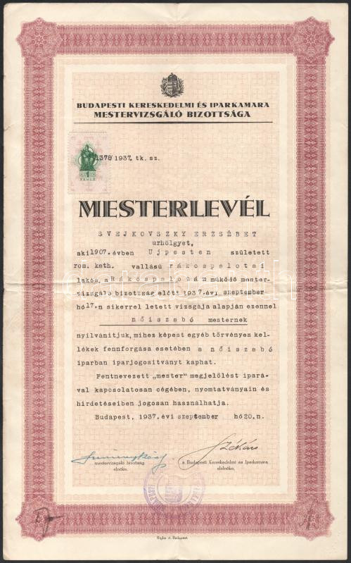Beschreibung: 1937 Budapest, mesterlevél, rákospalotai női szabó részére.