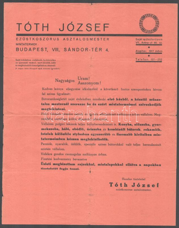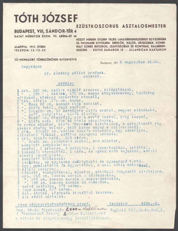 1938 Bp., Tóth József műasztalos mester fejléces számla https://www.darabanth.com/de/510-Fernauktion/510.0/Kunst-Dokumente-andere-Sammelgebiete/Dokument~803/1938-Bp-Toth-Jozsef-muasztalos-mester-fejleces-szamla~II3433206