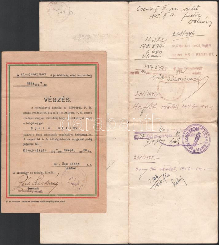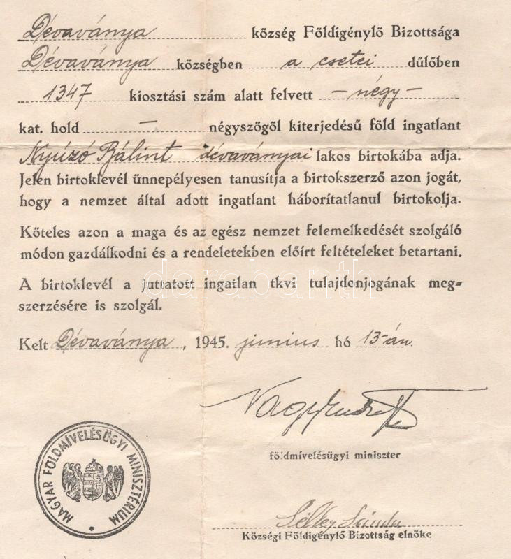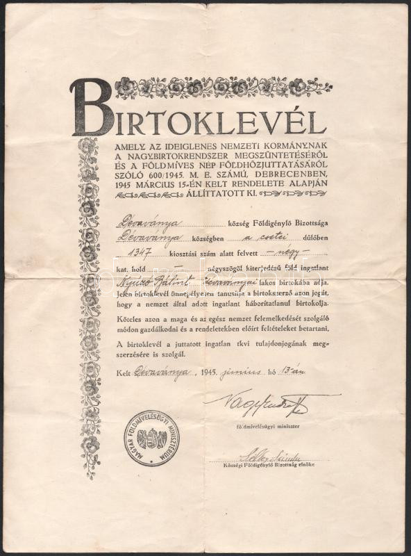 Beschreibung: 1945 Dévaványa, az Ideiglenes Nemzeti Kormány nagybirtokrendszer megszüntetésérÅ‘l szóló rendelete alapján kiadott birtoklevél Nyúzó Bálint dévaványai lakos részére, Nagy Imre földművelésügyi miniszer nyomtatott aláÃrásával, hátoldalán feljegyzésekkel + 1947 A kisújszállási járásbÃróság, mint telekkönyvi hatóság végzése tulajdonjog bekebelezésérÅ‘l, kisebb szakadással