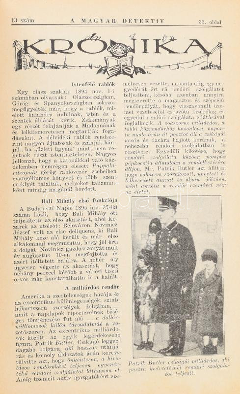 1927 A Magyar Detektív c. képes folyóirat II. évf. 13-24. számai egybekötve (1927. júl. 1. - dec. 15.), főszerk.: Dr. Csécsy József, sérült félvászon-kötésben, levált gerinccel, helyenként kissé foltos, sérült lapokkal.