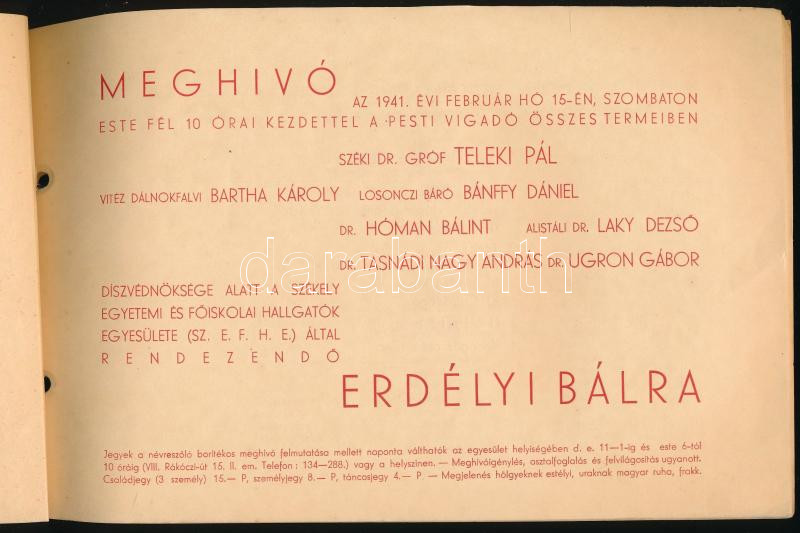 1941 Meghívó a Székely Egyetemi Hallgatók Egyesülete által rendezendő ... https://www.darabanth.com/de/510-Fernauktion/510.0/Kunst-Dokumente-andere-Sammelgebiete/Drucksachen~821/1941-Meghivo-a-Szekely-Egyetemi-Hallgatok-Egyesulete-altal-rendezendo-Erdelyi-balra-jo-a~II3446057