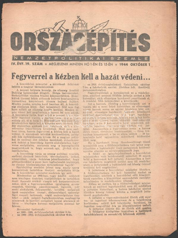 1944 Országépítés, Nemzetpolitikai Szemle c. folyóirat IV. évf. 19. sz... https://www.darabanth.com/de/510-Fernauktion/510.0/Kunst-Dokumente-andere-Sammelgebiete/Drucksachen~821/1944-Orszagepites-Nemzetpolitikai-Szemle-c-folyoirat-IV-evf-19-szama-1944-okt-1-sze~II3446688