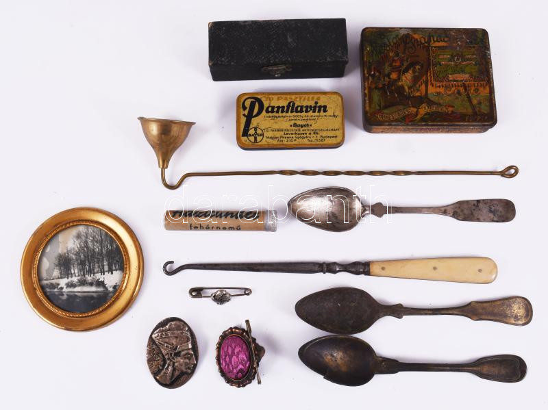 Beschreibung: Kis doboznyi vegyes bolha tétel, közte gyertyakoppintó antik fémdoboz, kanalak, bross, stb.
