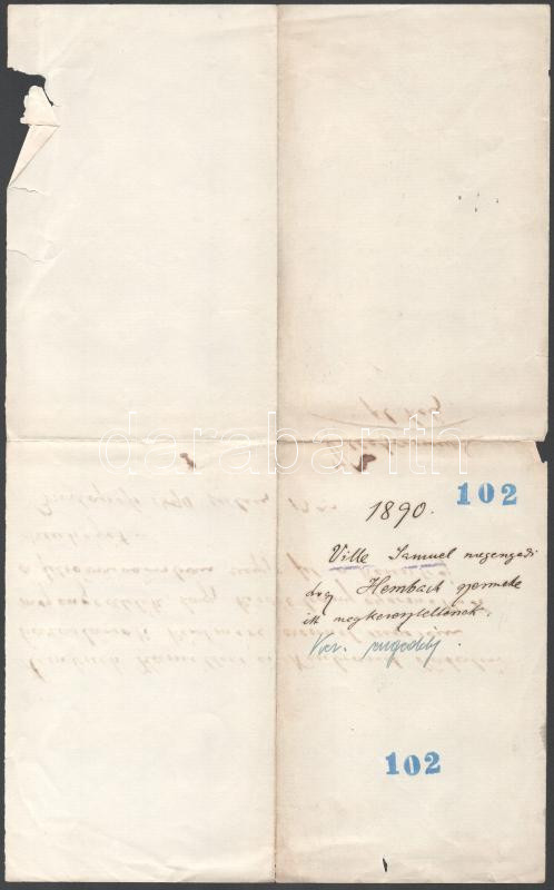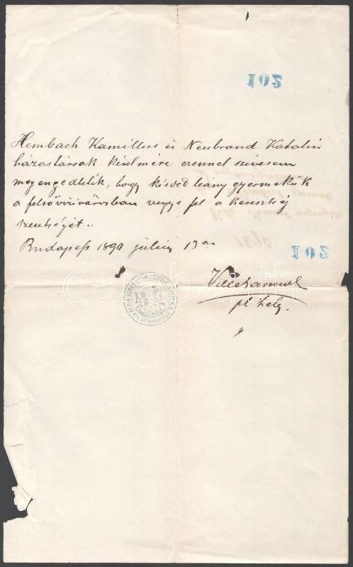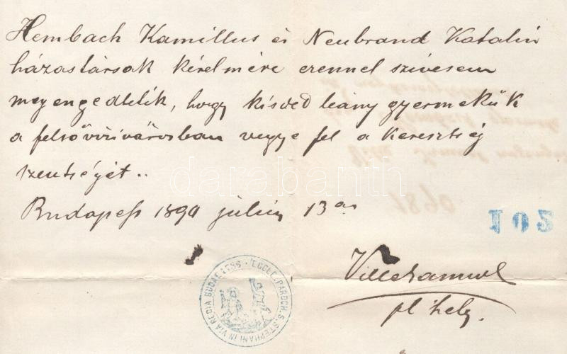 1890 Bp., Ville Sámuel plébános által kiállított engedély Hembach Kamillus és Neubrandt Katalin részére, hogy gyermeküket a a felsővízivárosi plébániatemplomban kereszteltethessék meg
