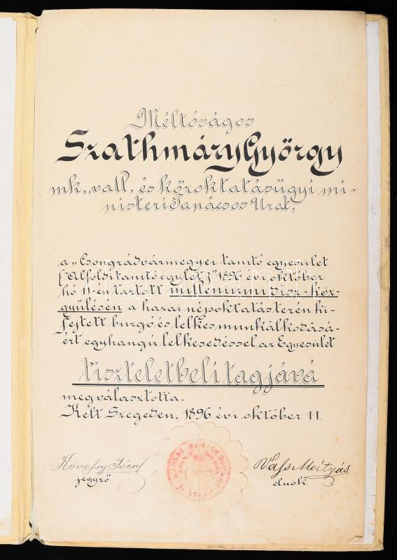 1896 Csongrádvármegyei Tanító Egyesület milleniumi díszközgyűlésének díszoklevele Szathmáry György miniszeri tanácsos részére. Egészvászon díszborítóval.