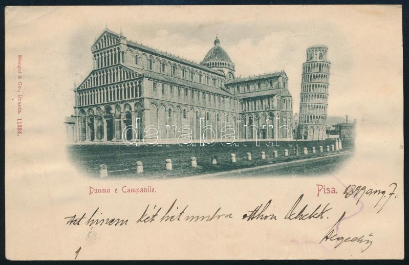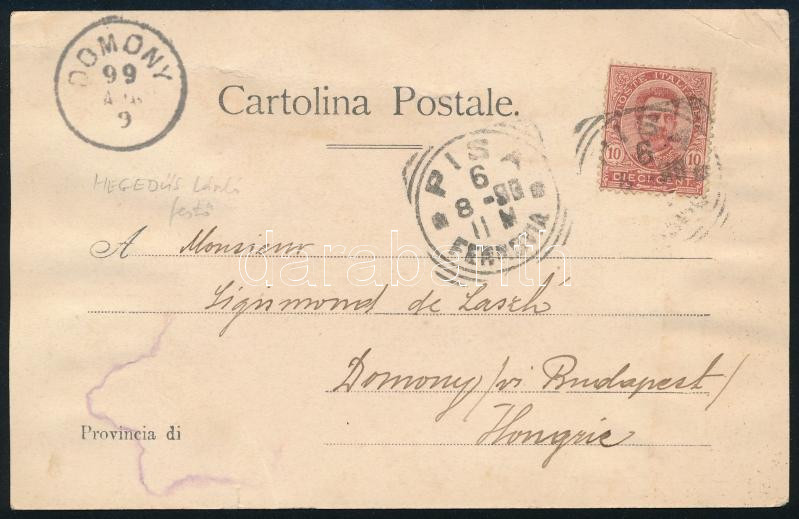 Beschreibung: 1899 Pisa, Hegedűs László (1870-1911) festőművész saját kezűleg megírt, aláírt képeslapja, ázásnyomokkal