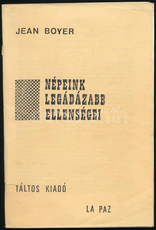Jean Boyer: Népeink legádázabb ellenségei La Paz, Táltos kiadó, Emigrá... https://www.darabanth.com/de/510-Fernauktion/510.0/Kunst-Dokumente-andere-Sammelgebiete/Judaica~810/Jean-Boyer-Nepeink-legadazabb-ellensegei-La-Paz-Taltos-kiado-Emigrans-kiadasu-antiszemit~II3437621