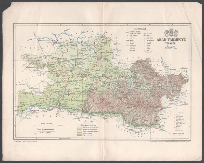1895 Arad vármegye térképe, tervezte: Gönczy Pál, 1 : 550.000, Bp., Posner Károly Lajos és Fia, a Pallas Nagy Lexikona melléklete, sarokhiány, törésnyom, 23,5x29,5 cm