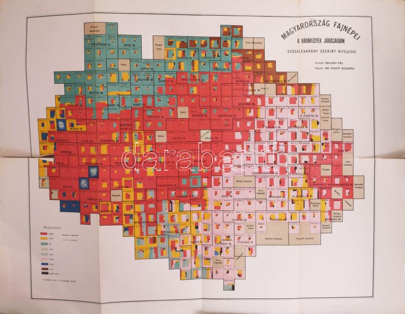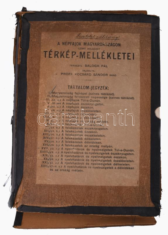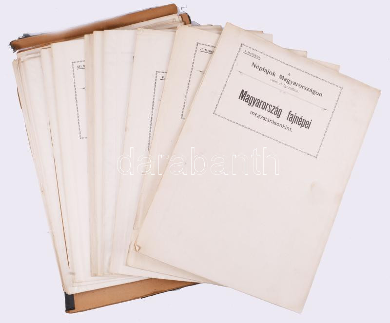 A népfajok Magyarországon című dolgozat térkép-mellékletei. Tervezete: Balogh Pál. Rajzolta: Proff Kocsárd Sándor báró. 22 tábla, 5 hiánnyal, széteső tokban