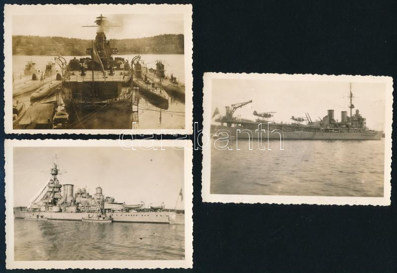 cca 1930-1940 Hadihajókat, tengeralattjárókat ábrázoló felvételek, köztük a HSwMS Gustaf Vsvéd partvédő csatahajó, 3 db fotó, jelzés nélkül, 6,5x9,5 cm