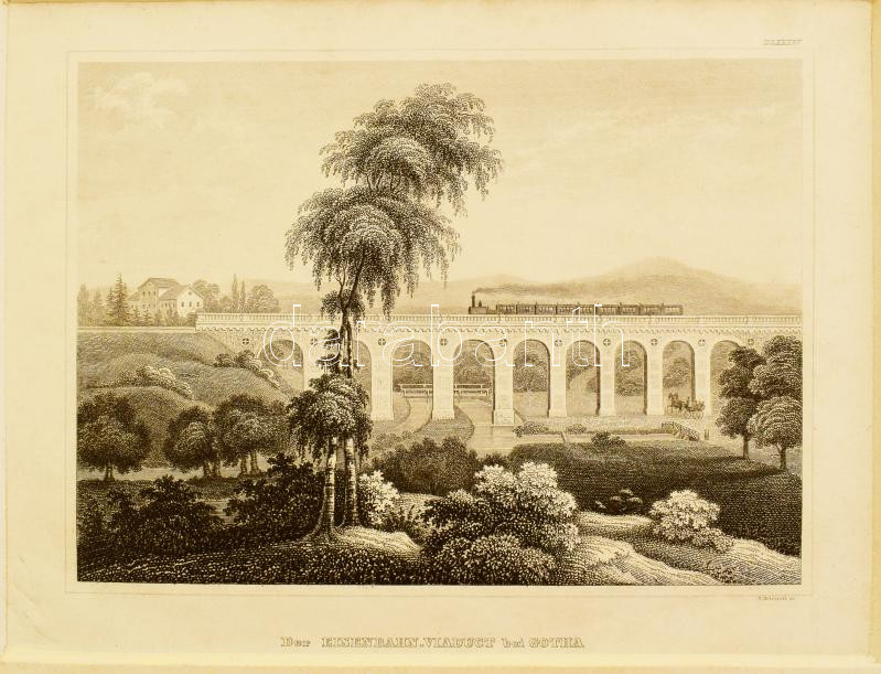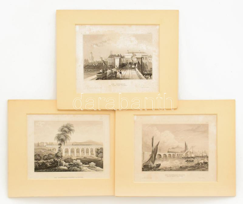 3 db vasút témájú metszet, : ca 1840-1860 London - Greenwich vasút, Gotha vasúti híd, Der Eisenbahn-Viaduct Über Die Lagunen Nach Venedig. [Velencei vasúti híd] rézmetszetek. Kb 11x15 cm Paszpartuban.