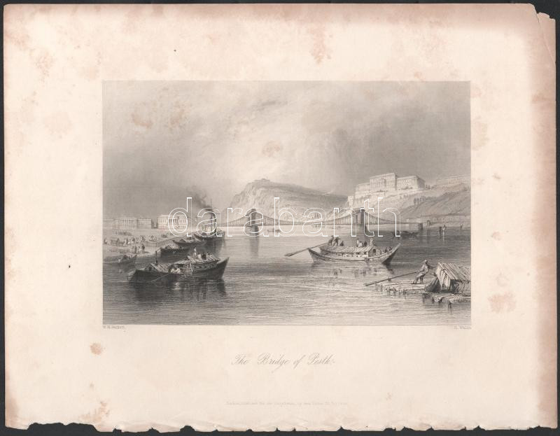 Bartlett, William Henry (1809-1854) - Wallis, Robert (1794-1878): A Lánchíd Pest és Buda között (The Bridge of Pesth). Acélmetszet, papír, jelzett a metszeten, kisebb lapszéli sérülésekkel, foltokkal, 12x18 cm
