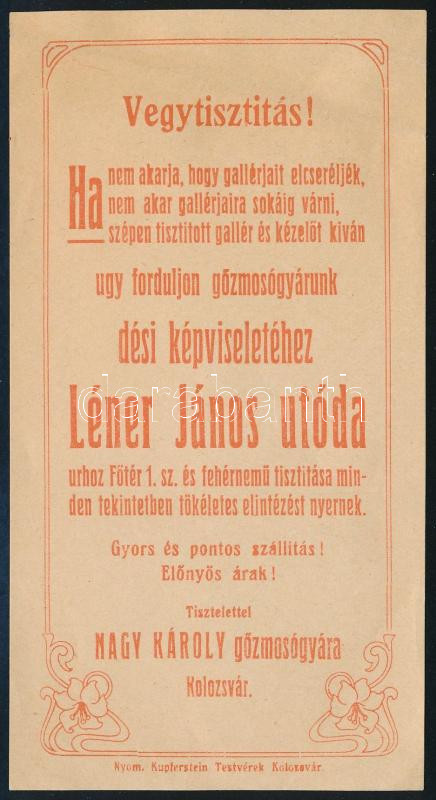 1913 A kolozsvári (Erdély) Nagy Károly gőzmosógyár dési képviselete sz... https://www.darabanth.com/de/510-Fernauktion/510.0/Kunst-Dokumente-andere-Sammelgebiete/Werbungen~808/1913-A-kolozsvari-Erdely-Nagy-Karoly-gozmosogyar-desi-kepviselete-szamolocedulaja-ha~II3453414