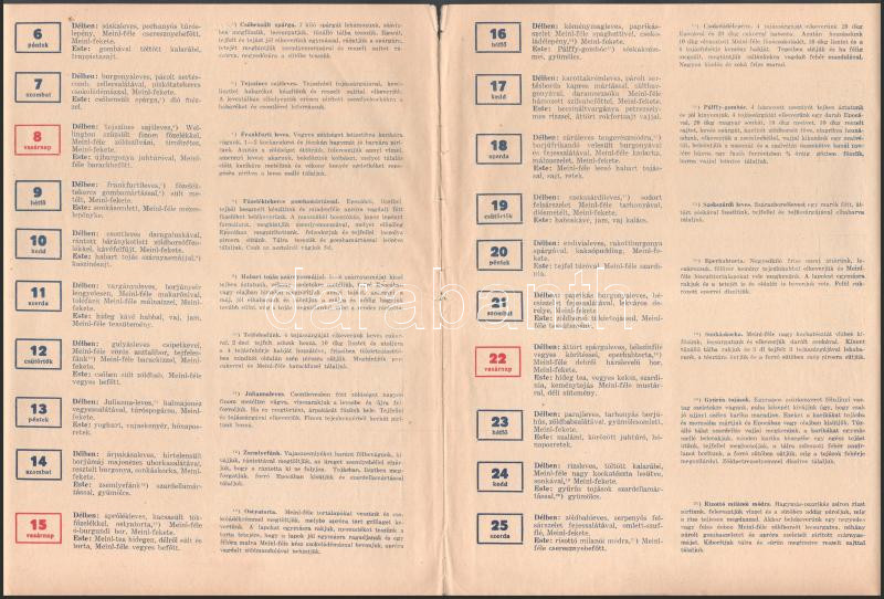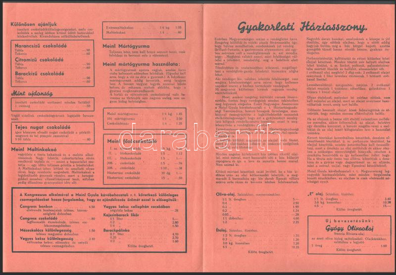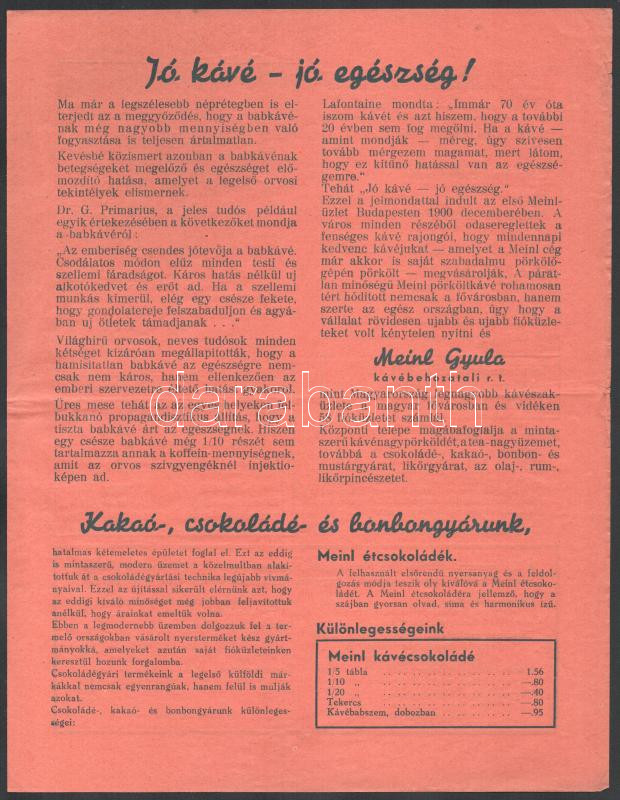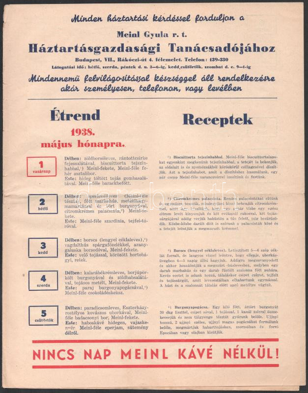 1938 Meinl Gyula Rt. Háztartásgazdasági Tanácsadója, étrend és receptek 1938. május hónapra, 4 p. + Meinl Gyula kávé és csokoládé reklámprospektus, 4 p.