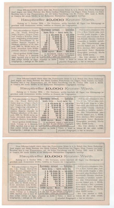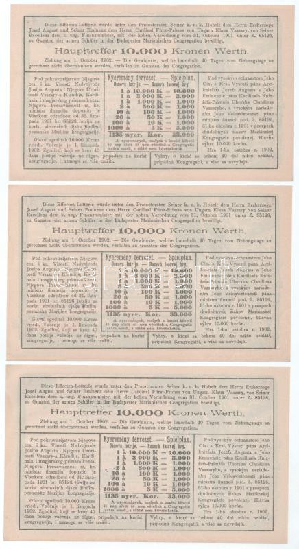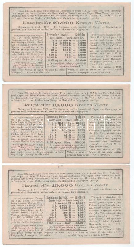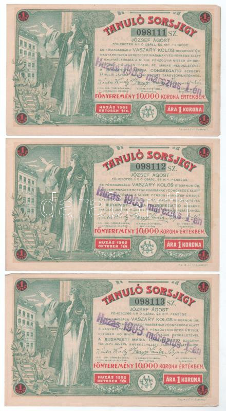 1903 Budapest "Tanuló Sorsjegy" 1K értékben (9x) kétszer három sorszámkövetők "098111 - 098113"; "098281 - 098283" és egy egyszer három egyugrásos sorszámkövetők "098414 - 098417" között. Mind vízjeles papíron, felülbélyegzéssel T:AU sarokhajlás, fo.