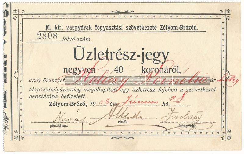 1906 Zólyombrézó "Magyar Királyi Vasgyárak Fogyasztási Szövetkezete" névre szóló üzletrészjegy 40K-ról T:AU