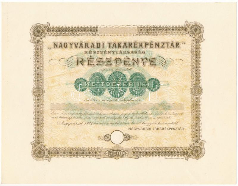 1921 Nagyvárad "Nagyváradi Takarékpénztár Részvénytársaság" ... https://www.darabanth.com/de/510-Fernauktion/510.0/Numismatik/Aktien-und-Tickets~689/1921-Nagyvarad-3Cem3ENagyvaradi-Takarekpenztar-Reszvenytarsasag3Cem3E-kitoltetlen-reszven~II3412193