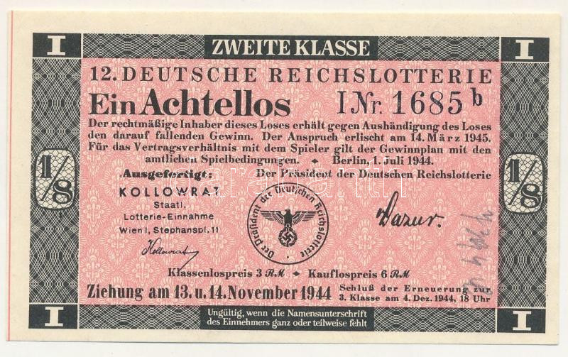 Német Harmadik Birodalom 1944. "12. Deutsche Reichslotterie (12. Német Birodalmi Sorsjáték)" 2. osztály 1/8 sorsjegye, vízjeles papíron, sorszámozással T:AU
