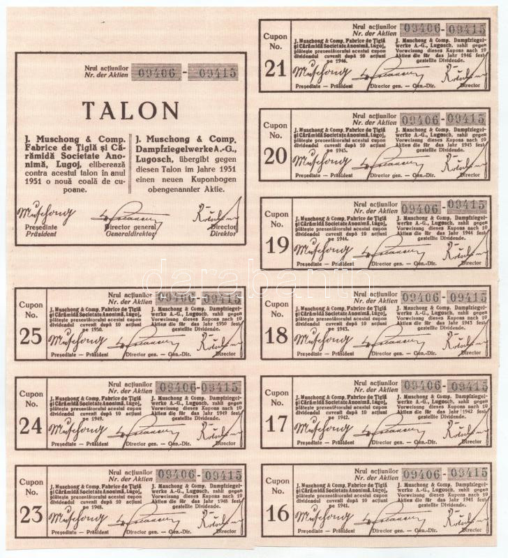 Beschreibung: Románia / Lugos 1925. "J. Muschong & Comp Gőztégla-És Tetőcserépgyárak Rt. " részvénye 1000L-ről, szelvényekkel, "09406-09415", bélyegzéssel és szárazpecséttel T:AU