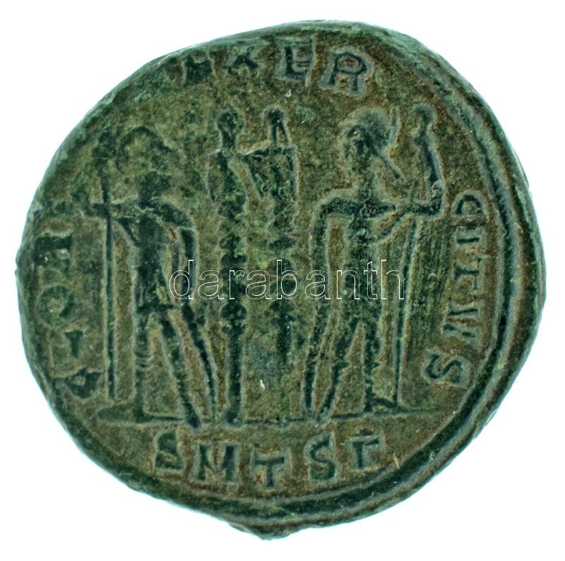 Roman Empire / Thessalonica / Constantine II 334-335. Follis bronze "FL IVL CONSTANTIVS NOB C / GLOR-[IA] EXER-CITVS SMTSgamma" two soldiers with two standards between them, o on banner (2,55g) C:XF