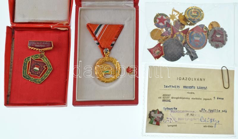 1976. "Kiváló ÚttörÅ‘vezetÅ‘ - ElÅ‘re" aranyozott, műgyantűs kitüntetés mellszalagon, miniatűrrel tokban + hozzá tartozó Adományozási Igazolvány + 1983. "Törzsgárdajelvény bronz fokozata" viselésére jogosÃtó igazolvány, miniatűrrel + DN(~1980) "Kiváló Ifjú Szakember" zománcozott fém jelvény + "A Vállalat Kiváló Brigádja - Szocialista Brigád" zománcozott bronz kitüntetÅ‘ jelvény tokban + 4xklf "Szocialista Brigád" jelvény + 2db miniatűr + "Kiváló Társadalmi Munkás" aranyozott fém kitüntetÅ‘ jelvény + "SZIT" zománcozott jelvény + "A Magyar Népköztársaság ÚttörÅ‘je" jelvény + "A Magyar Népköztársaság Kisdobosa" jelvény + "Magyar-Szovjet Baráti Társaság" műgyantás aranyozott jelvény T:AU-VF