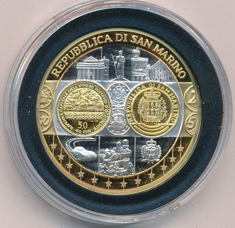2002-2010 k. "Emlékérem az euróövezet országainak közös valutájáról - San Marino" aranyozott, ezüstözött Cu-Ni emlékérem kapszulában, tanúsítvánnyal (35mm) T:PP
