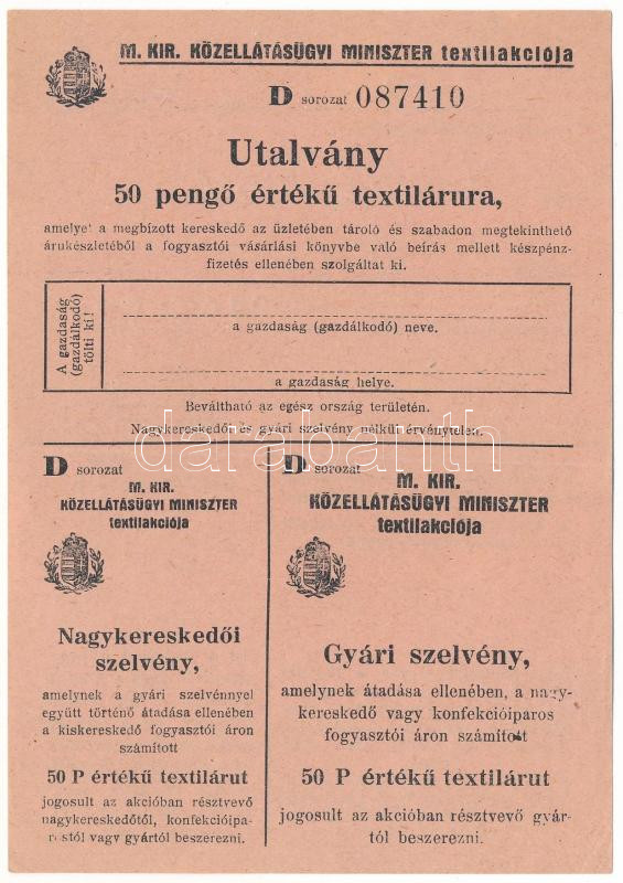 1926-1945 k. A Magyar Királyi Közellátásügyi miniszter textilakciójána... https://www.darabanth.com/de/510-Fernauktion/510.0/Numismatik/Notgeld-aus-Papier-und-Metall~690/1926-1945-k-A-Magyar-Kiralyi-Kozellatasugyi-miniszter-textilakciojanak-utalvanya-50P-erte~II3446487