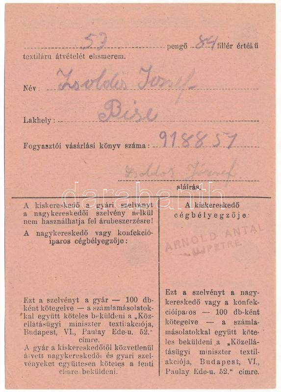 Beschreibung: 1926-1945 k. A Magyar Királyi Közellátásügyi miniszter textilakciójának utalványa 50P értékű textiláruról "D 087410" T:AU