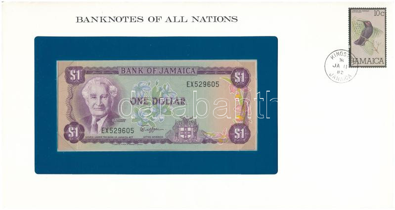 Jamaica 1989. 1 Dollar in "Banknotes of all Nations" banknote envelope with stamp and cancellation C:UNC