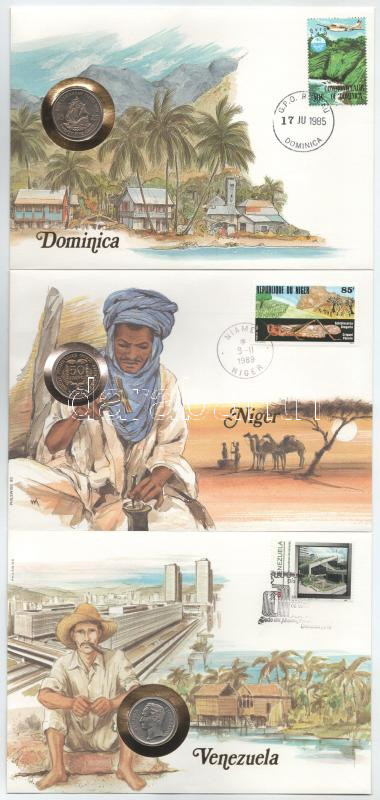 Vegyes, 3xklf érmés boríték tétel, bélyeggel, bélyegzéssel és német nyelvű leírással, benne: Kelet-Karibi Államok / Dominika 1981. 25c "II. Erzsébet" + Nigéria 1974. 1k + Venezuela 1977. 1B T:UNC, Venezuela VF