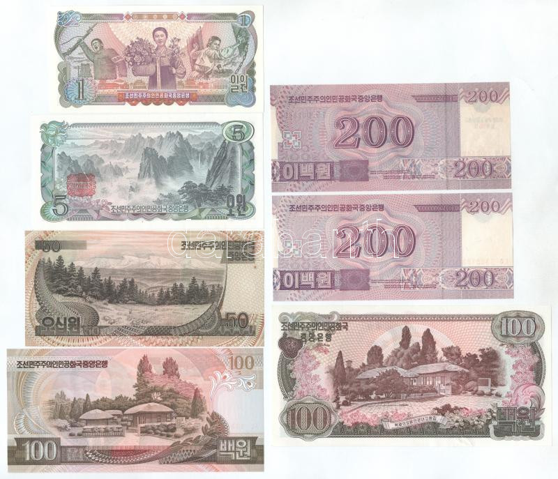 North Korea 1978. 1 Won + 5 Won + 100 Won + 1992. 50 Won + 100 Won + 2002. 200 Won (2xdiff: one of them with "100th birthday of Kim Jong Sook" overprint) C:AU