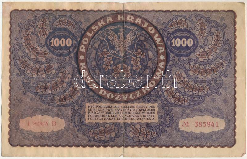 Beschreibung: Lengyelország 1919. 1000M vízjeles papíron "B 385941" T:F erős papír