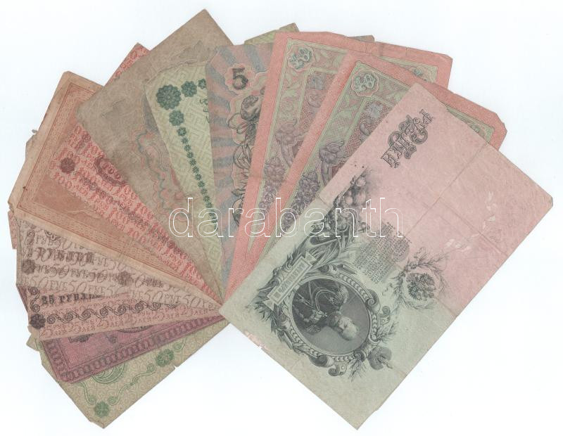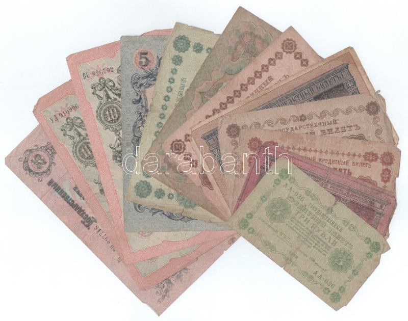 Russian Empire 1898(1915-1917) 1 Rouble (Sign.: Shipov) + 1905(1917-1921) 3 Roubles (Sign.: Shipov) + 1909(1909-1918) 5 Roubles (Sign.: Shipov) + 10 Roubles (2xdiff: Sign.: Shipov + Konshin) + 25 Roubles (Sign.: Shipov) + Soviet Union / Russian Socialist Federated Soviet Republic 1918. 3 Roubles - 250 Roubles (5xdiff) + Russian Civil War / First Siberian Provisional Administration 1918. 10 Roubles C:F,VG, tears, tiny missing material