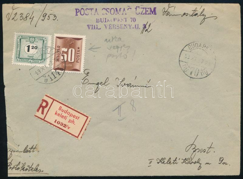 Beschreibung: 1953 Budapest helyi ajánlott levél vegyes portózással, ritka