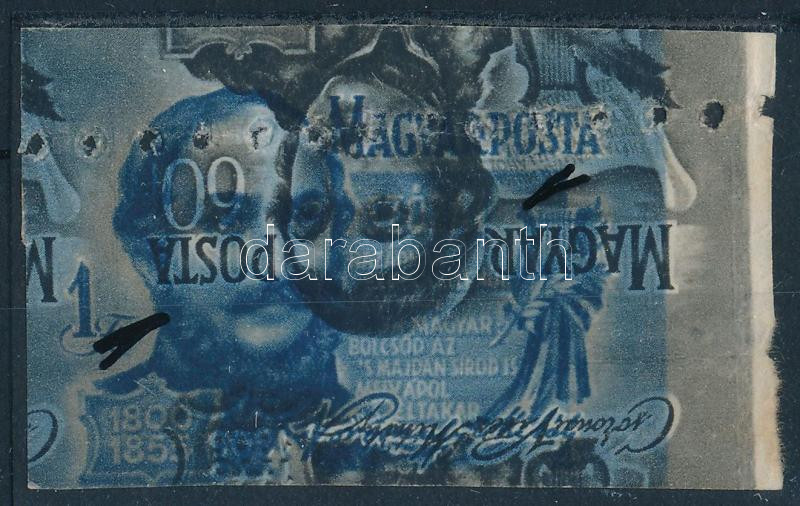 1955 Költők vágott 1Ft, rajta a 60f bélyeg képének fordított nyomata, megsemmisítő lyukasztással, gumi nélküli vágott, vízjeles papíron, RR! / inverted Mi 1446 on the Mi 1447 imperforate stamp with printers waste on paper with watermark