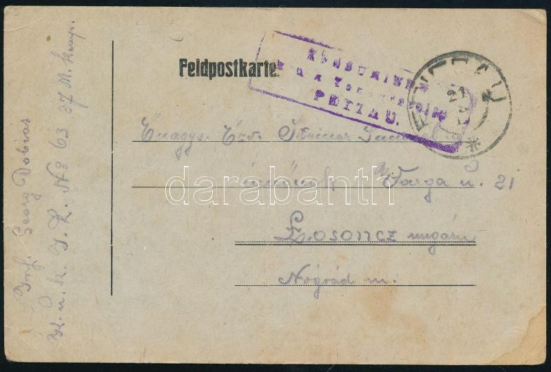 Beschreibung: 1917 Feldpostkarte Losoncra "PETTAU" cenzúrával