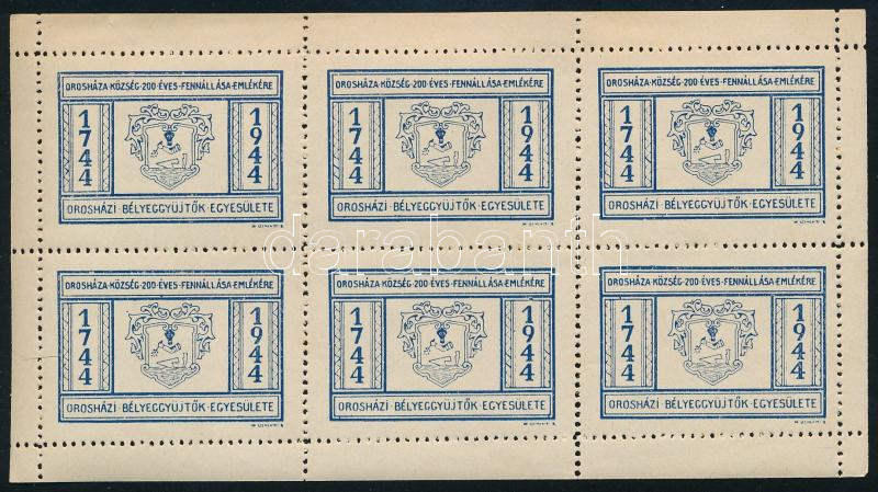 Beschreibung: 1944 Orosházi Bélyeggyűjtők Egyesülete, Orosháza község 200 éves fennállása emlékére 6 db-os levélzáró ív