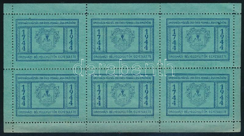 Beschreibung: 1944 Orosházi Bélyeggyűjtők Egyesülete, Orosháza község 200 éves fennállása emlékére 6 db-os levélzáró ív